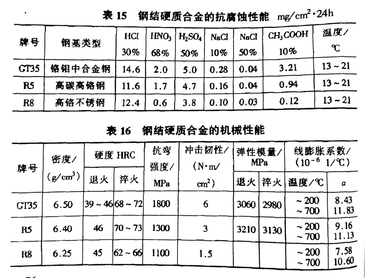 鋼結(jié)硬質(zhì)合金的耐腐蝕性能隨鋼基的類型不同而異。它們?cè)诤K蛪A液中的耐蝕性較好,在其他介質(zhì)中的耐蝕情況和機(jī)械性能見表 15、16。