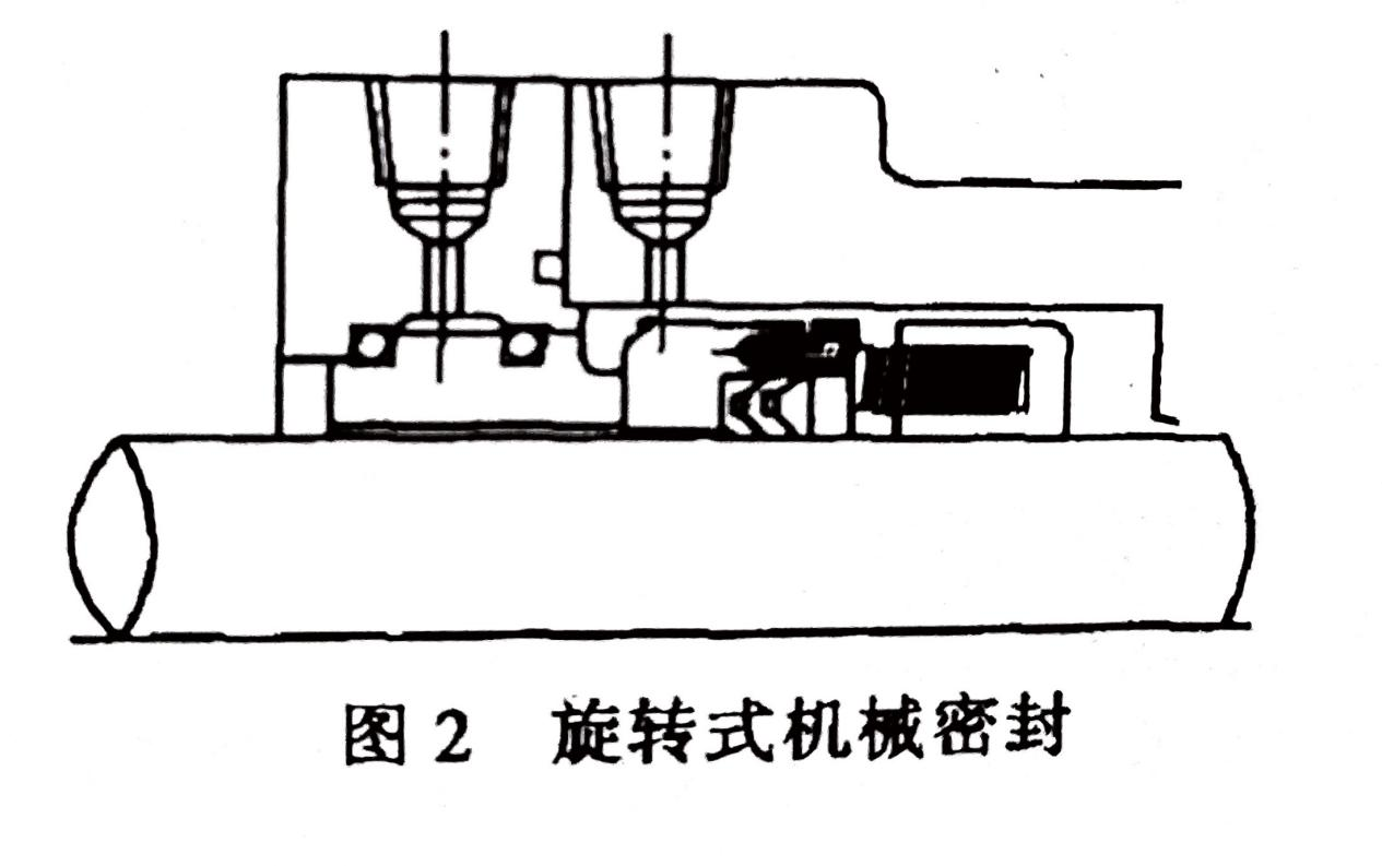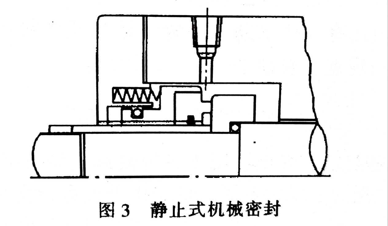按補(bǔ)償結(jié)構(gòu)彈性元件的運(yùn)動(dòng)情況,可以分為旋轉(zhuǎn)式和靜止式機(jī)械密封。補(bǔ)償結(jié)構(gòu)隨軸旋轉(zhuǎn)的稱為旋轉(zhuǎn)式機(jī)械密封(圖2);補(bǔ)償結(jié)構(gòu)不旋轉(zhuǎn)的(安裝在壓蓋內(nèi))稱為靜止式機(jī)械密封(圖3)。補(bǔ)償結(jié)構(gòu)旋轉(zhuǎn)時(shí)易發(fā)生質(zhì)量不平衡,同時(shí)消耗攪拌功率,因此,旋轉(zhuǎn)式密封不能用于高速;而靜止式密封可用于高速??墒切D(zhuǎn)式密封安裝較方便,所以,普通的機(jī)械密封大多選用旋轉(zhuǎn)式結(jié)構(gòu)。