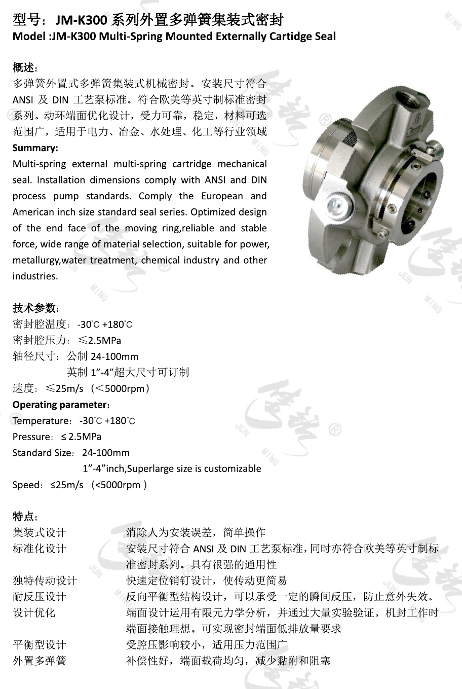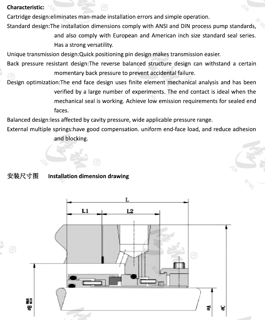 多彈簧外置式多彈簧集裝式機械密封。安裝尺寸符合ANSI及DIN工藝泵標(biāo)準(zhǔn)。符合歐美等英寸制標(biāo)準(zhǔn)密封系列。動環(huán)端面優(yōu)化設(shè)計,受力可靠,穩(wěn)定,材料可選范圍廣,適用于電力、冶金、水處理、化工等行業(yè)領(lǐng)域