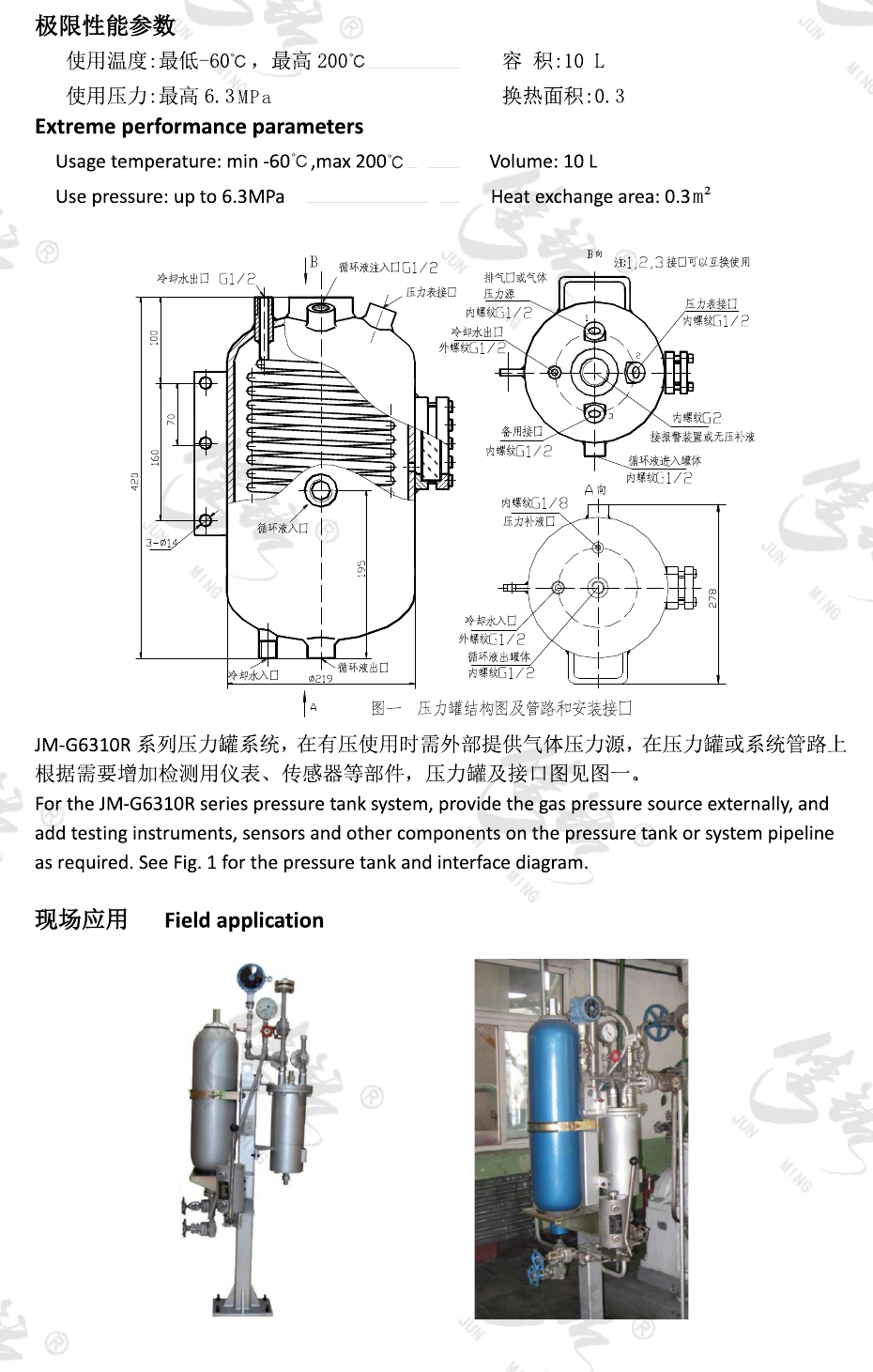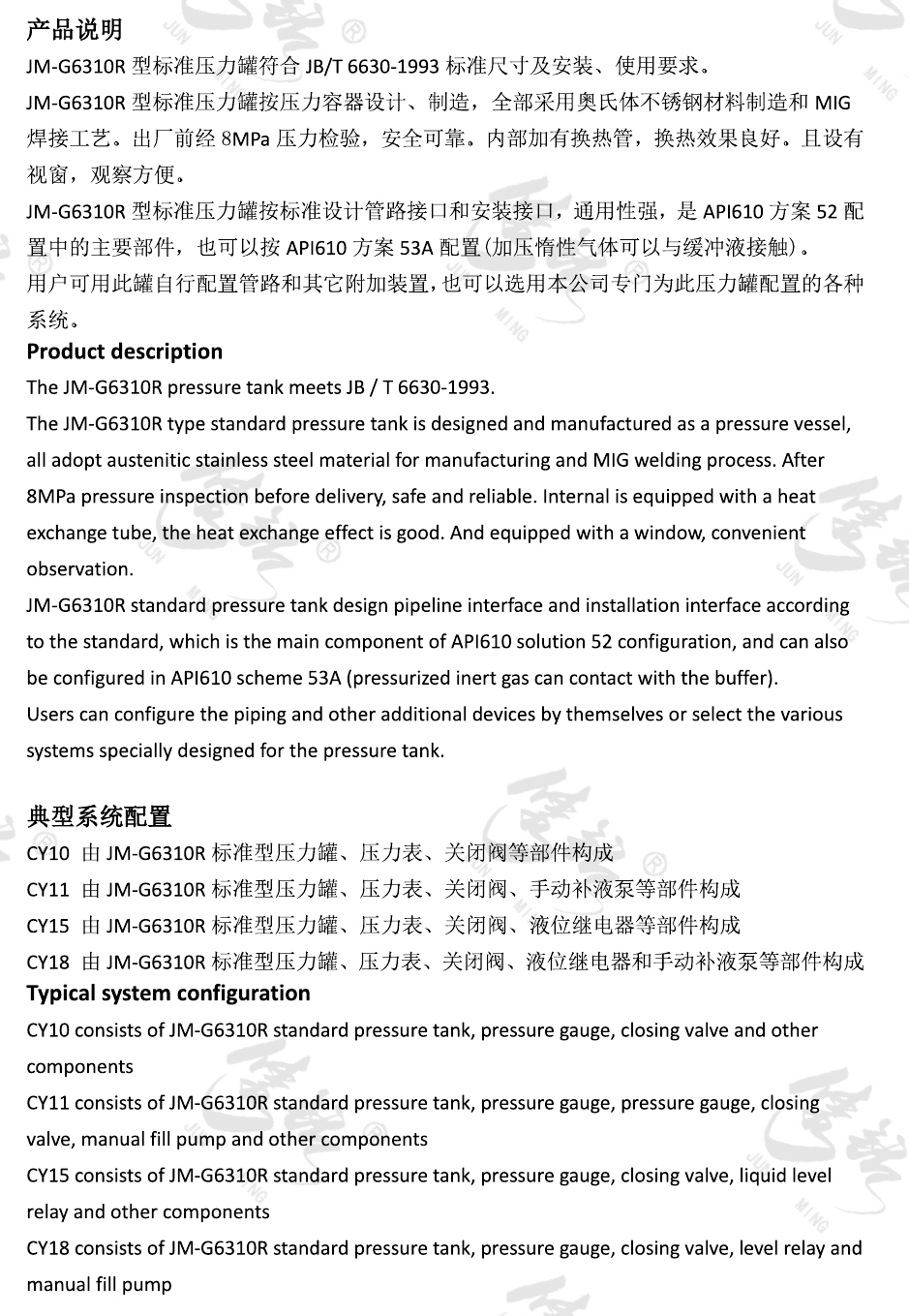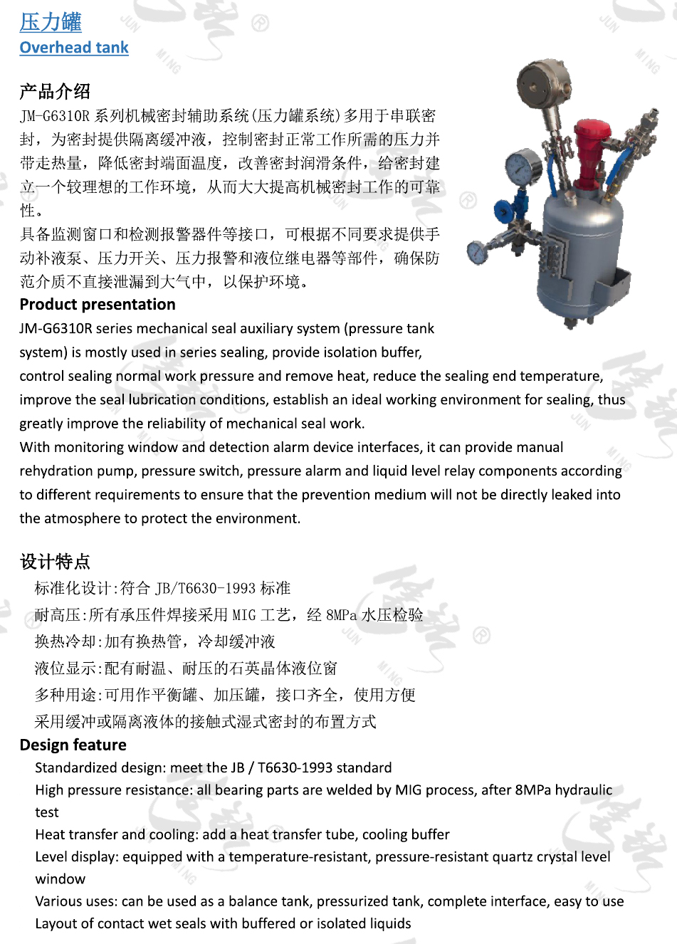 JM-G6310R系列機(jī)械密封輔助系統(tǒng)(壓力罐系統(tǒng))多用于串聯(lián)密封,為密封提供隔離緩沖液,控制密封正常工作所需的壓力并帶走熱量,降低密封端面溫度,改善密封潤(rùn)滑條件,給密封建立一個(gè)較理想的工作環(huán)境,從而大大提高機(jī)械密封工作的可靠性。