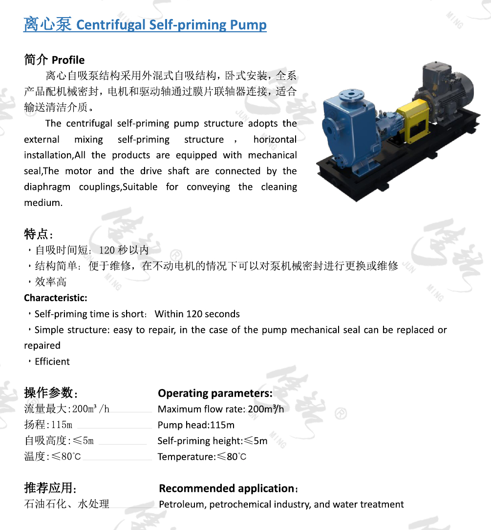 離心自吸泵結(jié)構(gòu)采用外混式自吸結(jié)構(gòu),臥式安裝,全系產(chǎn)品配機(jī)械密封,電機(jī)和驅(qū)動軸通過膜片聯(lián)軸器連接,適合輸送清潔介質(zhì)。